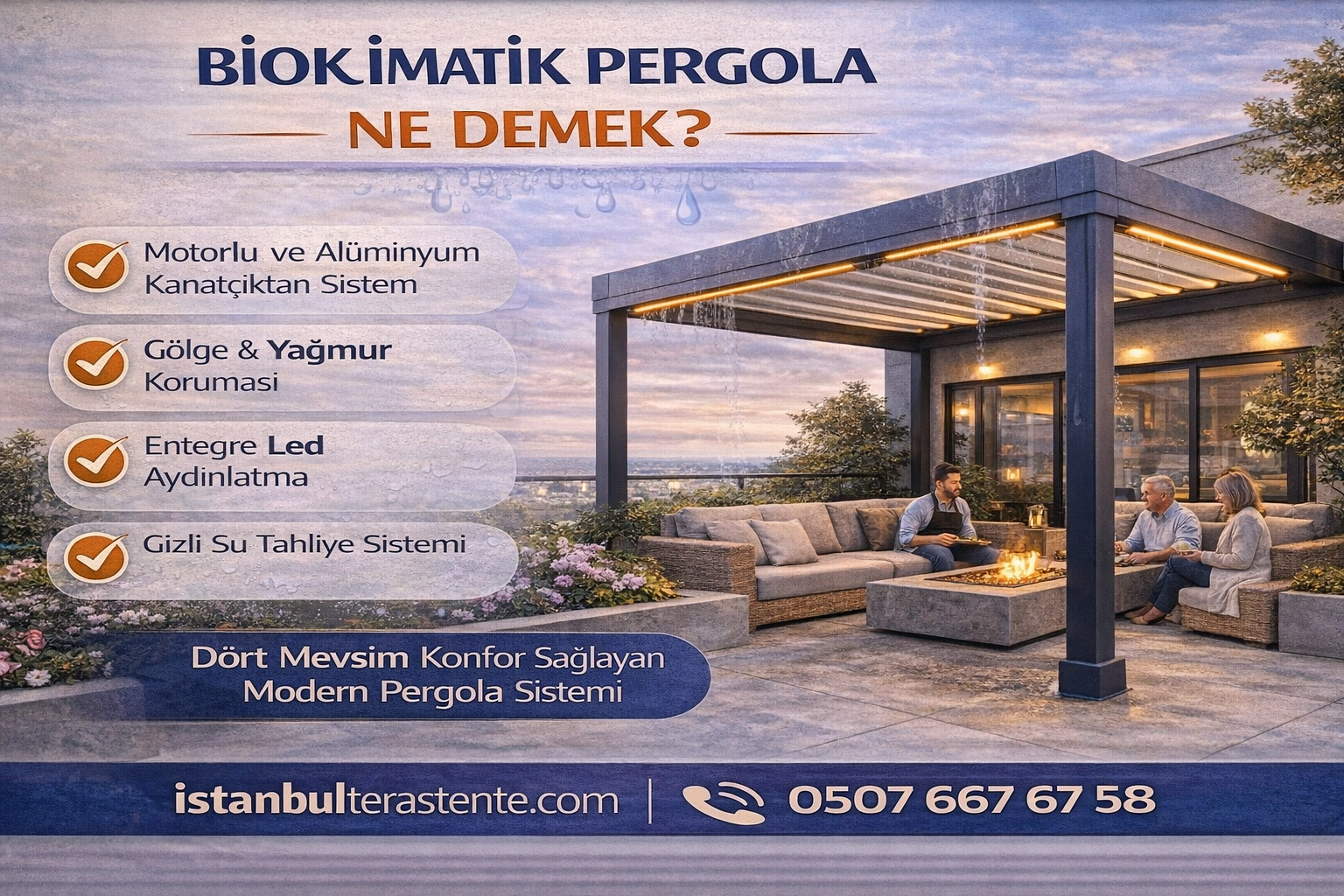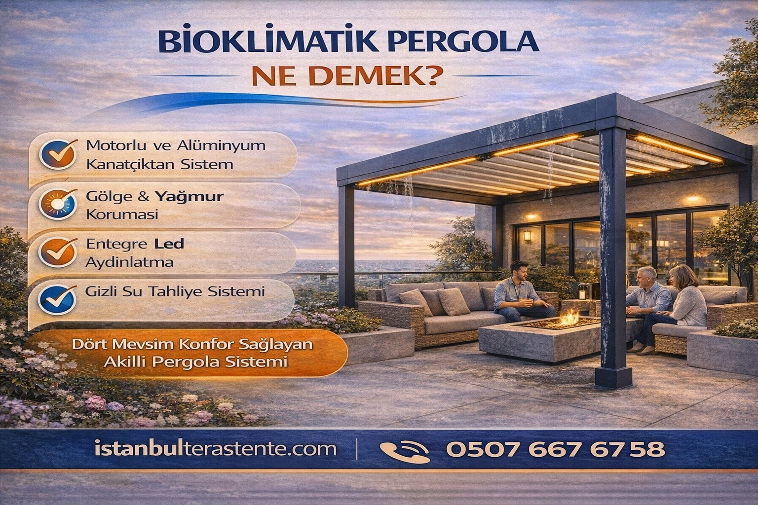 Teras/bahçe ölçünüz, rüzgâr yönü ve drenaj hattına göre en doğru projeyi planlayalım. Detaylar için bioklimatik pergola sayfamızı inceleyebilirsiniz.