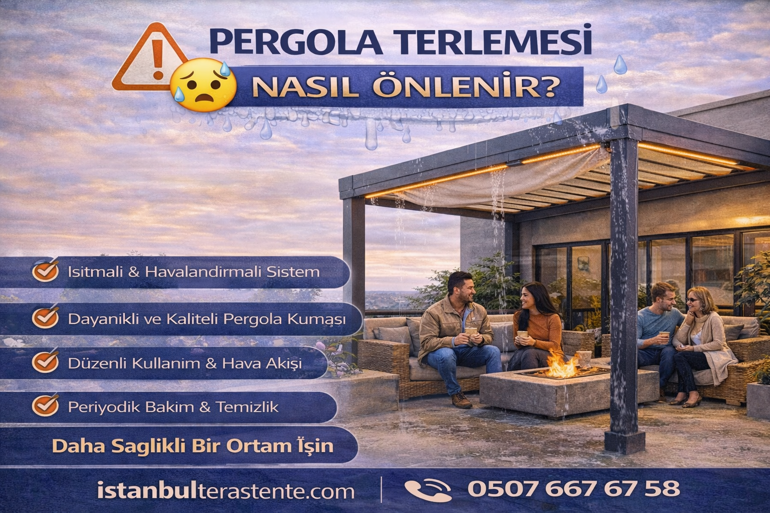 Terleme dediğimiz şey aslında yoğuşmadır: Havadaki su buharı, daha soğuk bir yüzeyle karşılaştığında gaz halinden sıvıya dönüşür ve yüzeyde damlacıklar oluşturur. Pergola yüzeyi (özellikle gece serinleyen metal parçalar veya kapalı hacimde soğuyan üst yüzey) dış ortam havasına göre daha soğuk kaldığında, nem yüzeye tutunur ve “terlemiş” gibi görünür.